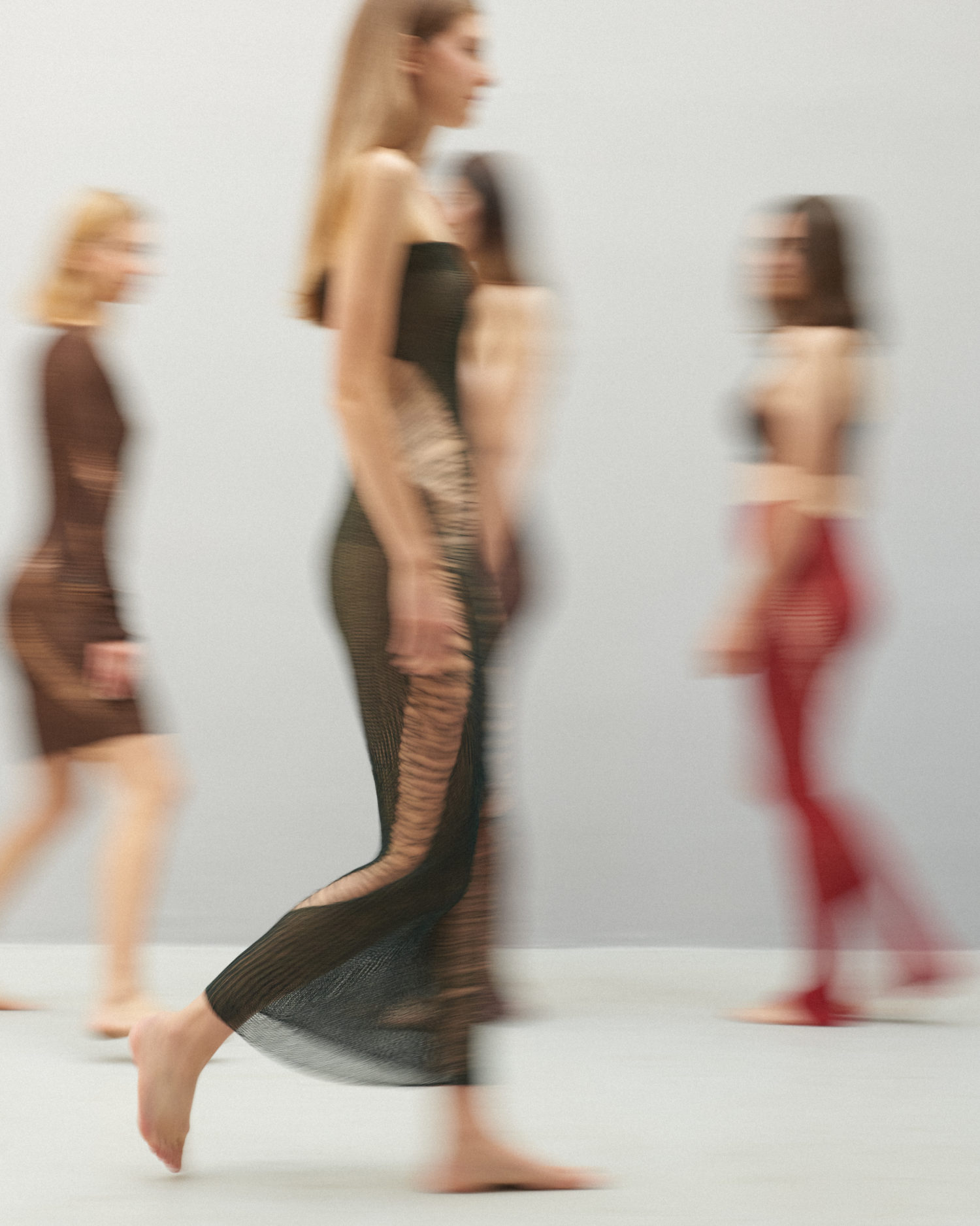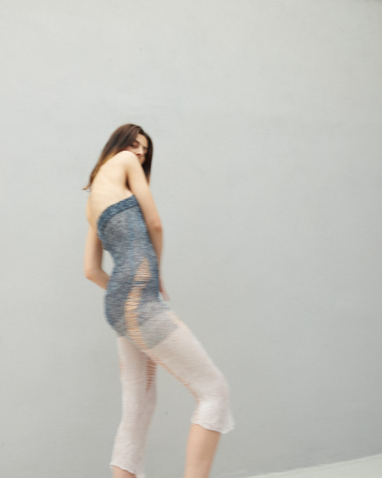 Kolekce je celá pletená na stroji MACH2S v dělení 8G. Tento stroj zvládne klasické ploché tvarované díly, stejně jako ob jehlu uplést 3D bezešvé oděvy. V této kolekci je využité právě 3D pletení. Zvoleným materiálem bylo viskózové hedvábí ve spojení s ažurovými motivy. Na fotkách je vidět, že stroj je spolehlivý a nemá problém ani s velmi dlouhými přetahovanými přízemi. Přetahované volné příze dokonce díky okům chyceným po stranách dokáží plést i přetahované příze dokola po obvodu těla.