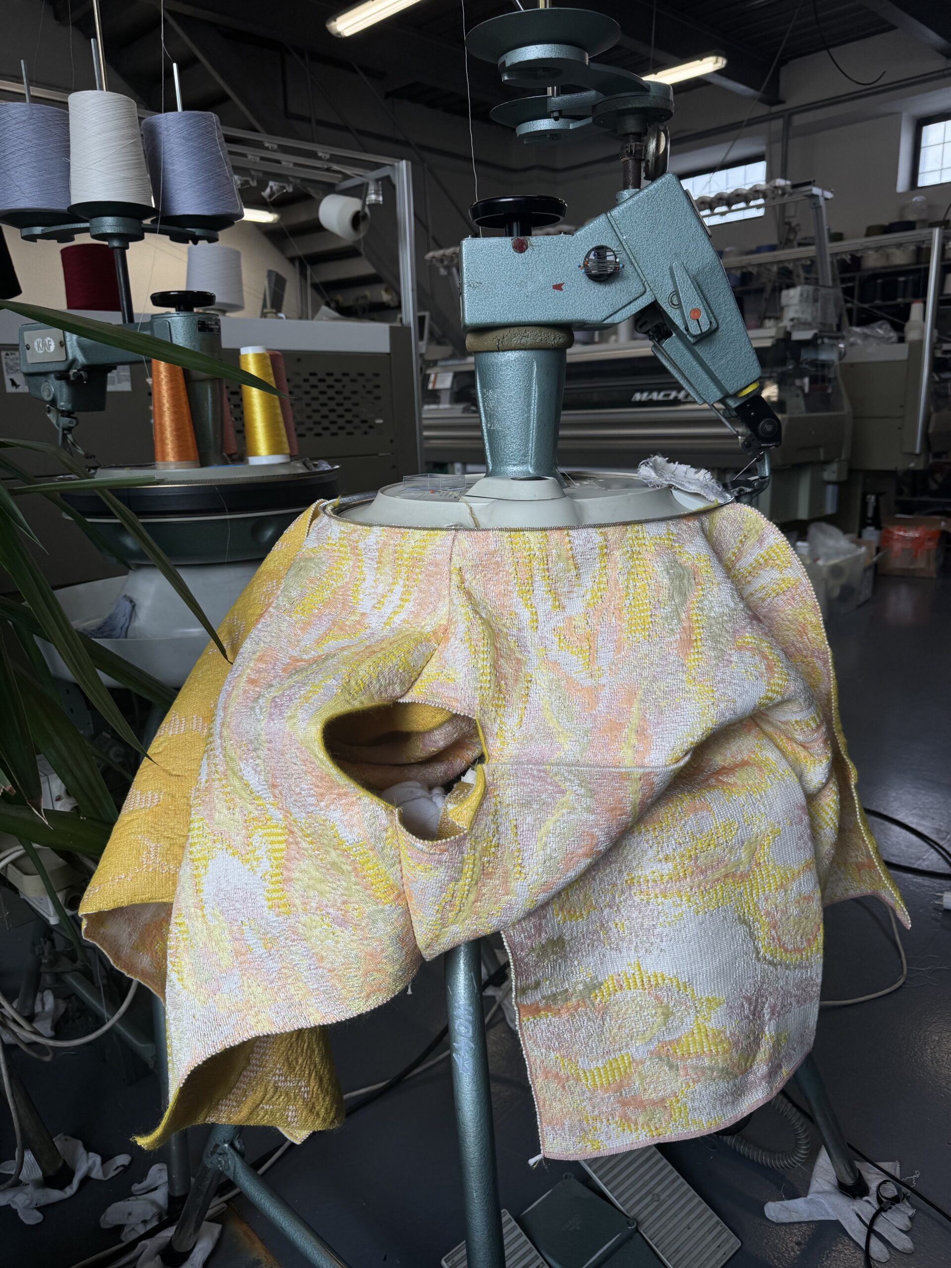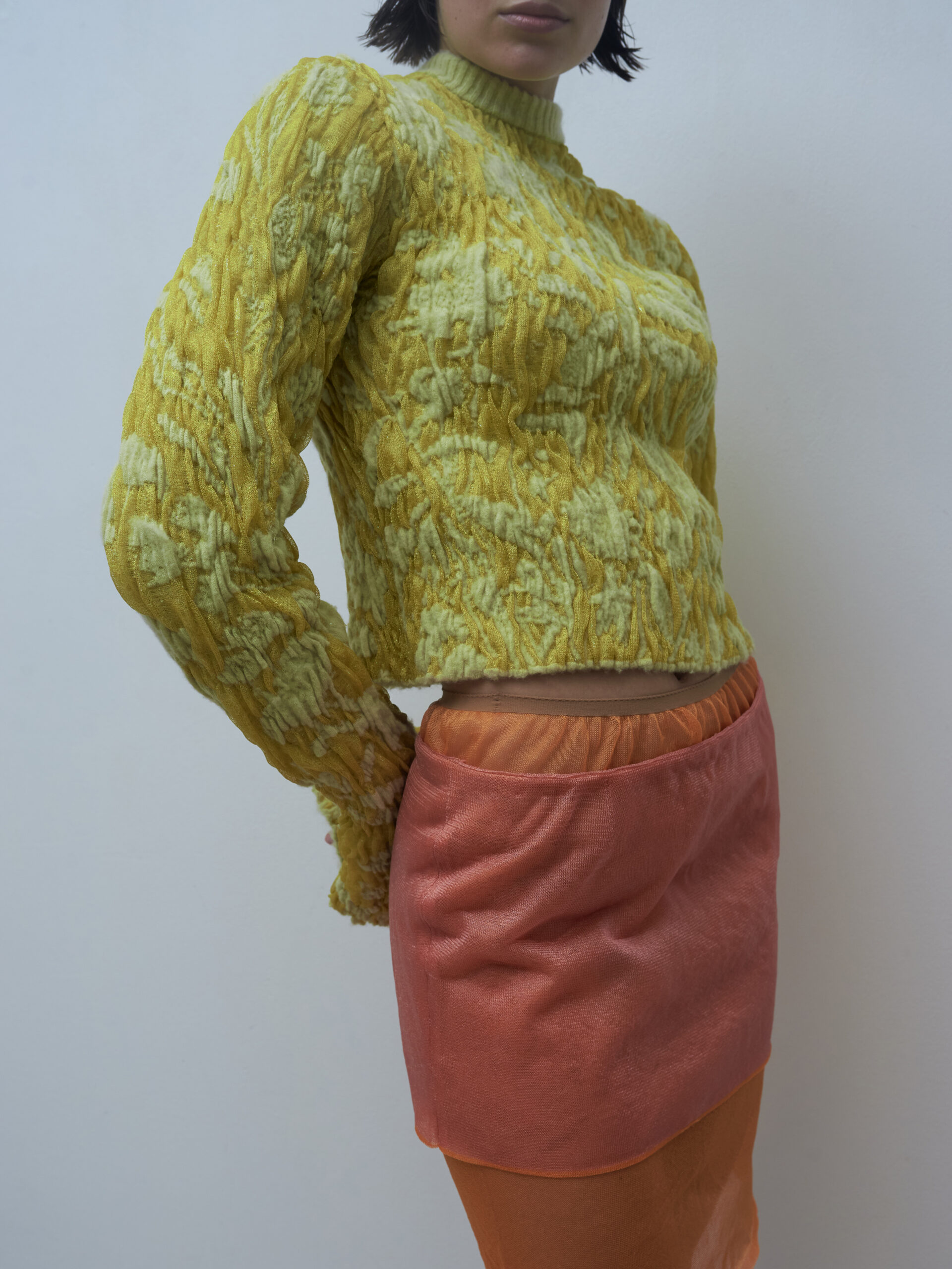 s dvoma hlavnými technikami: klasickým plochým pletením jednotlivých dielov, ktoré som následne ručne retiazkovala, a pletením na štvorlôžkovom stroji MACH2XS, ktorý umožňuje tvorbu bezšvových 3D odevov. Prvá technika si vyžaduje individuálne naprogramovanie každého dielu do tvaru strihu. Druhá technika, pletenie v celku bez švov, naopak prináša možnosť efektívnej výroby s minimálnym odpadom a novými konštrukčnými možnosťami.