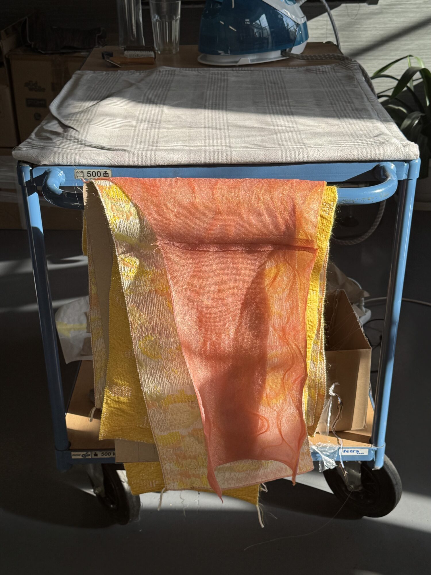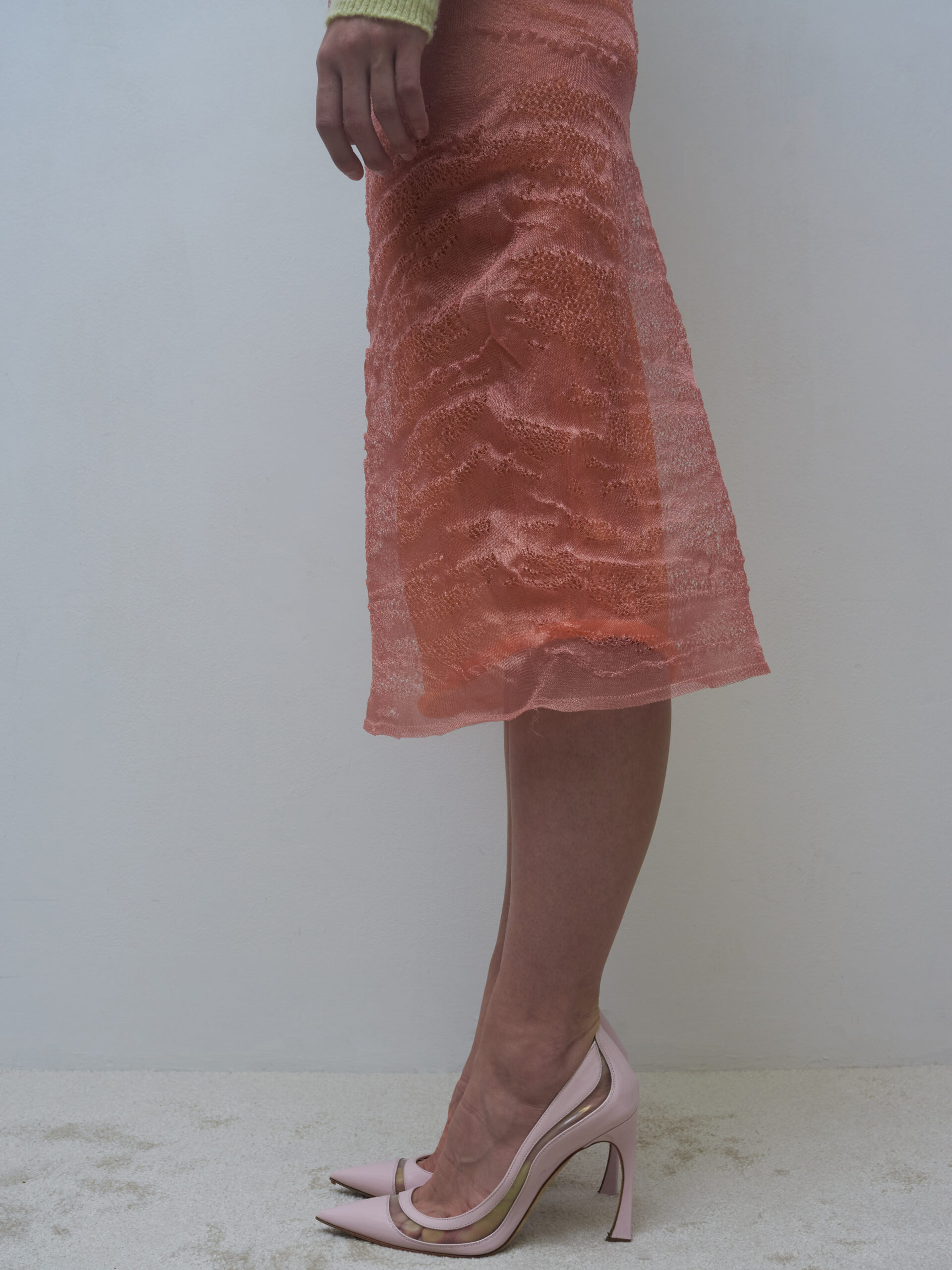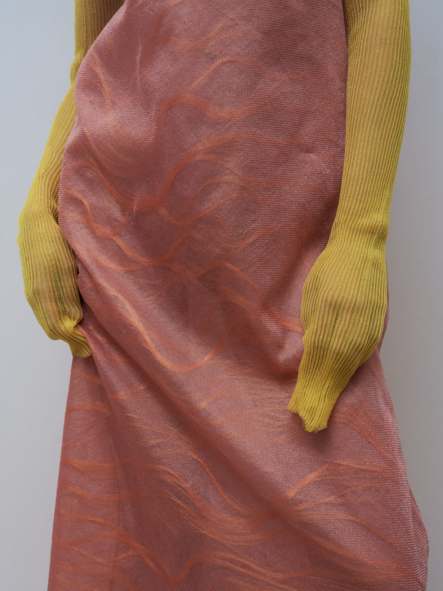 Pri výbere materiálov som sa sústredila na tenšie priadze, pretože som sa chcela hrať s transparentnosťou vrstiev pleteniny. Zvolila som syntetický monofilament Fishing od talianskej firmy Industria Italiana Filati . Je to veľmi tenké vlákno (112 000 Nm) s leskom pripomínajúcim rybársku sieť, vhodné pre jemné delenie až 18G. Pre kontrast k lesklým pleteninám som kolekciu doplnila o mäkšie, hrejivé kúsky z priadze Mulan fine od Manifattura Sesia (55 % baby suri alpaka, 30 % extrafine merino, 15 % polyamid, jemnosť 20 000 Nm). Táto priadza má