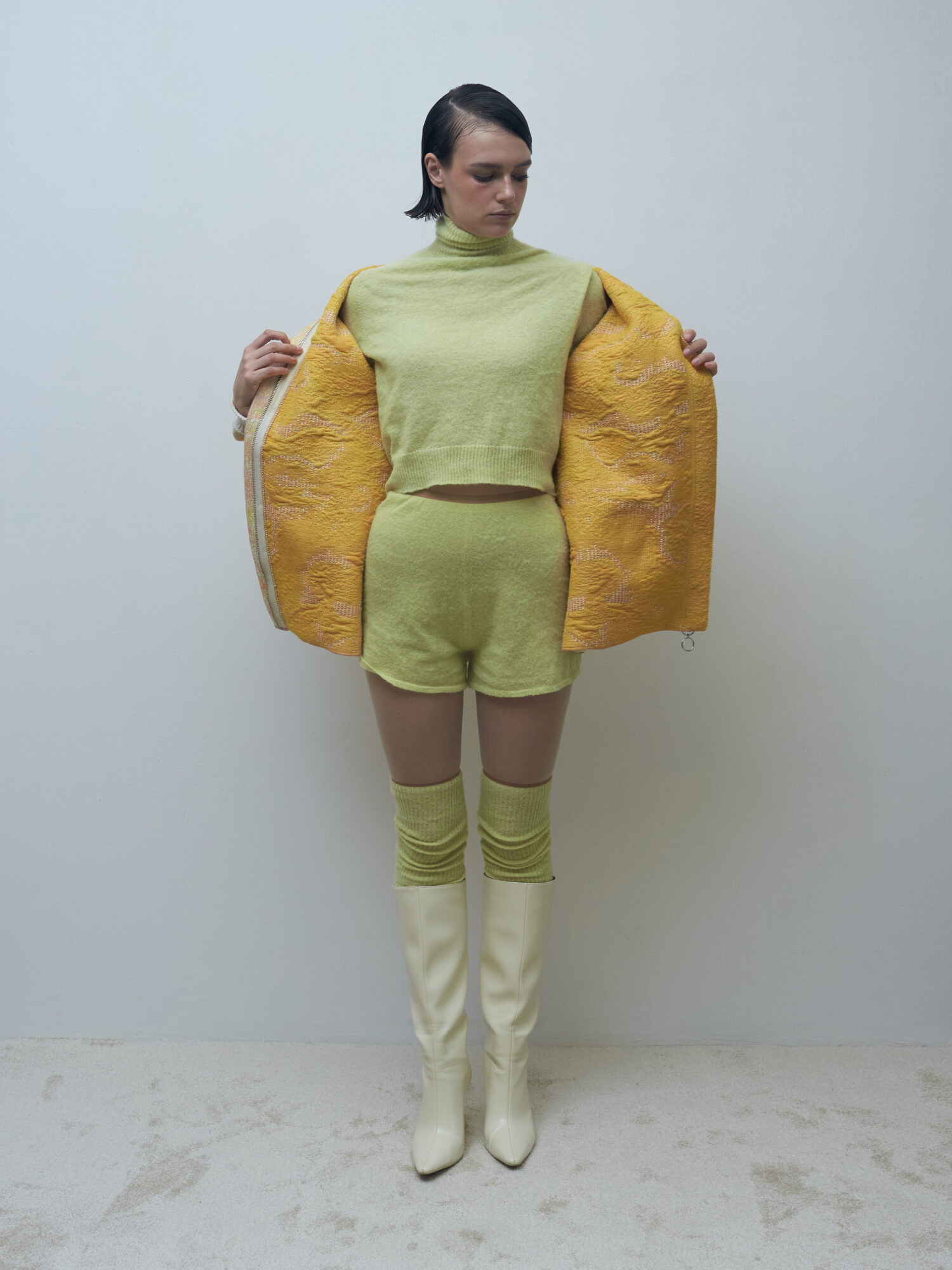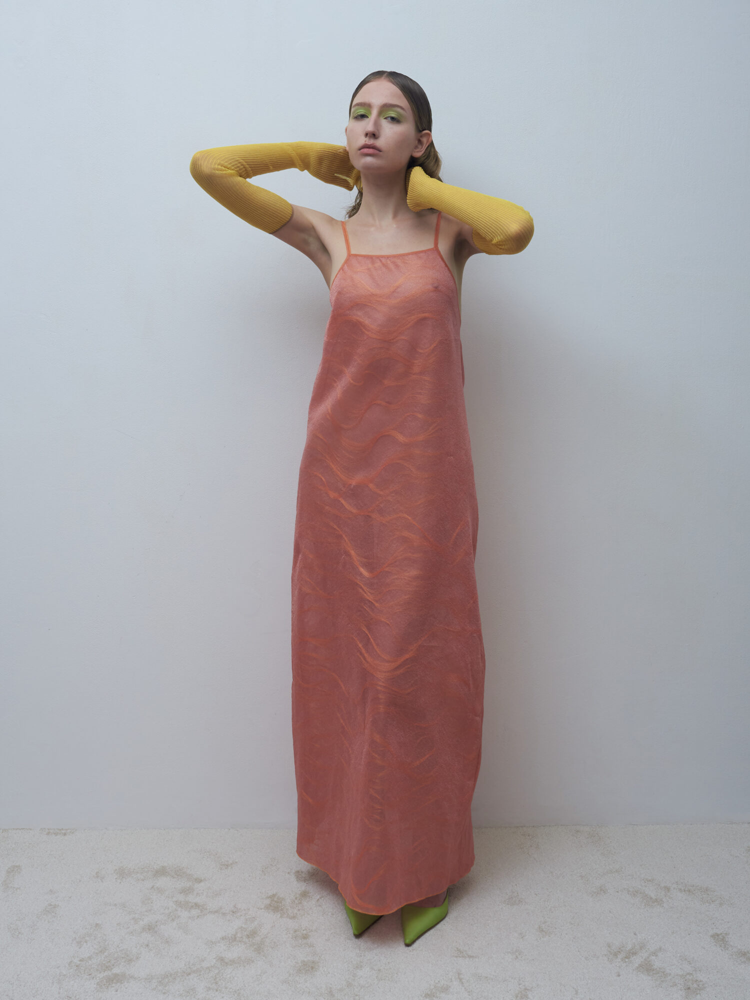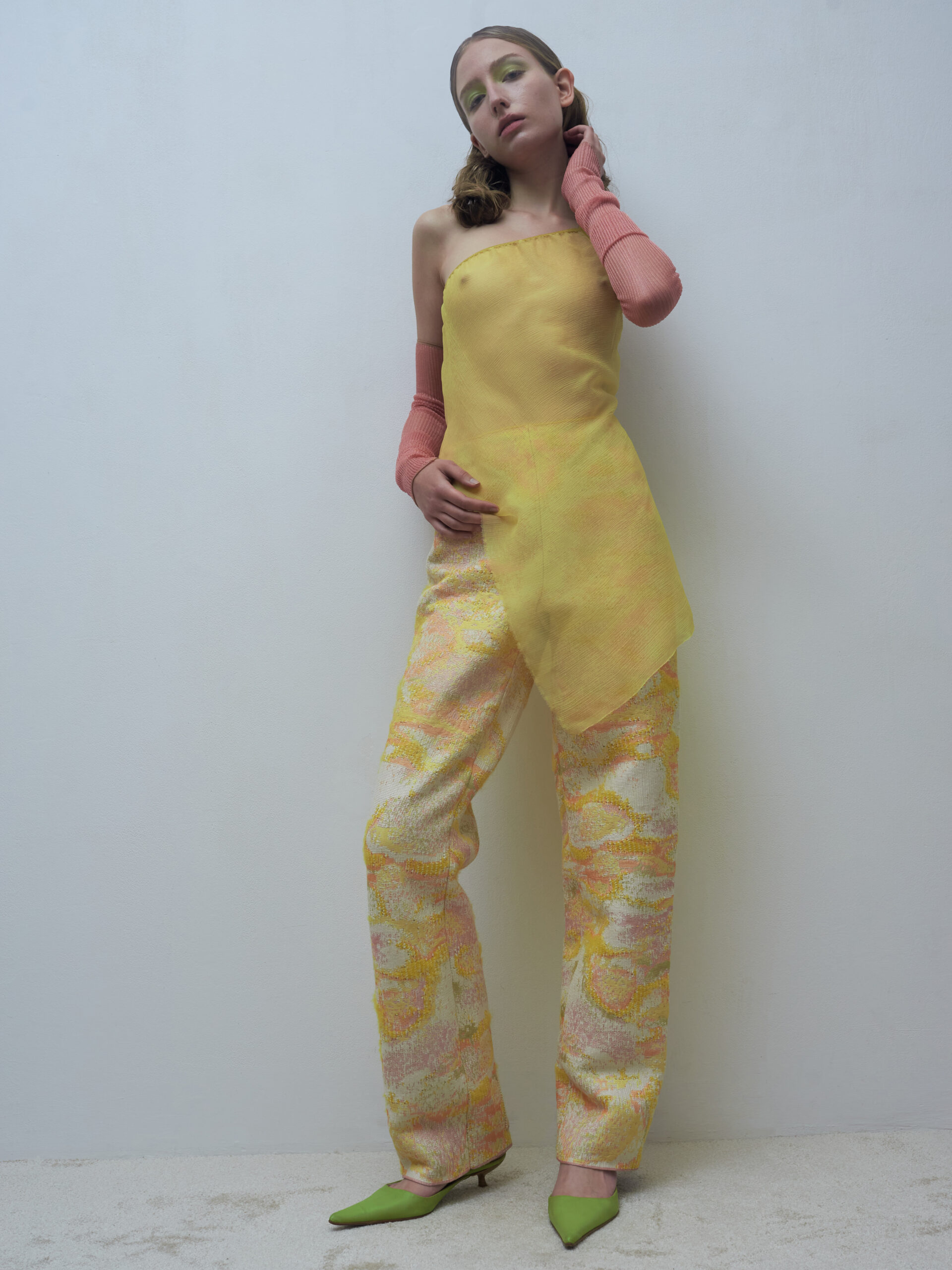 Materiálovo sa v kolekcii prepája lesklosť a tvrdosť syntetického monofilamentu s mäkkosťou alpaky. Niečo ako metafora života, kde aj nečakané alebo „chybné“ momenty majú svoj význam. Transparentné vrstvy zdôrazňujú krehkosť tela, no zároveň jeho silu. Telo sa nestráca, len jemne presvitá, pripomínajúc, že odev je len prechodová vrstva medzi nami a svetom. Siluety sú voľné, prispôsobivé, rešpektujú telo a spolupracujú s ním. Kolekcia je pozvaním do pomalšieho tempa, do všímavejšieho prežívania. Nie je o dokonalosti, ale o vnímaní krásy v každodennosti – aj vtedy, keď sa veci nevyvíjajú podľa plánu.