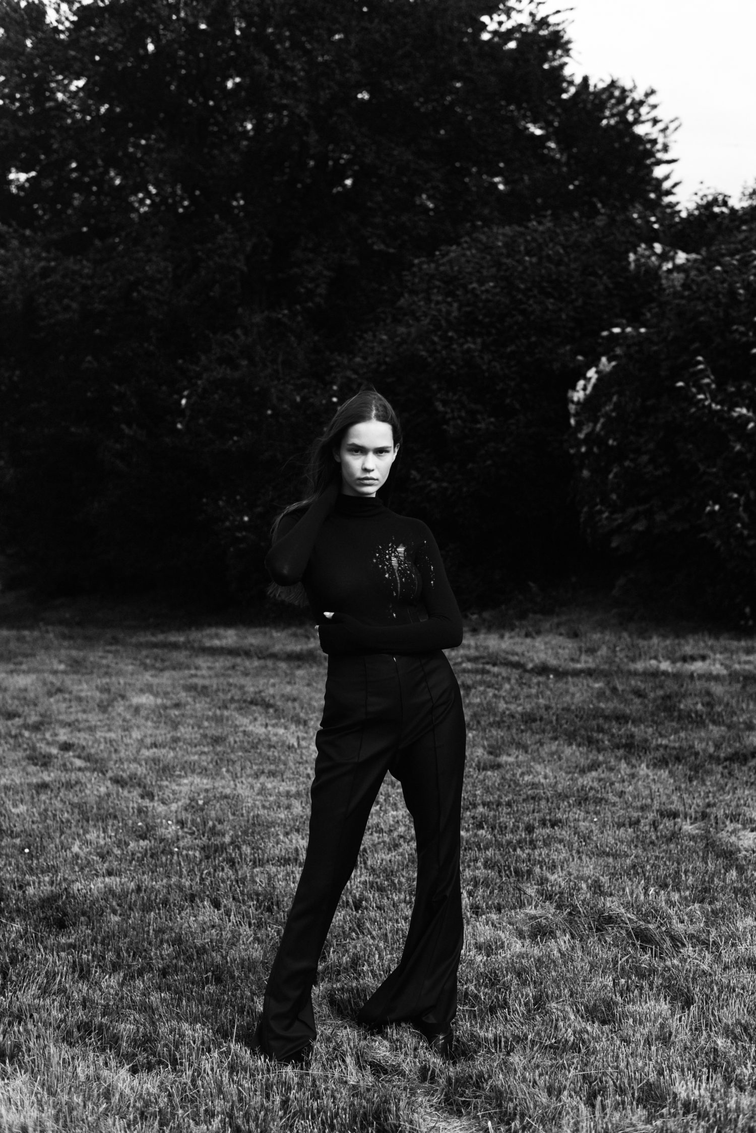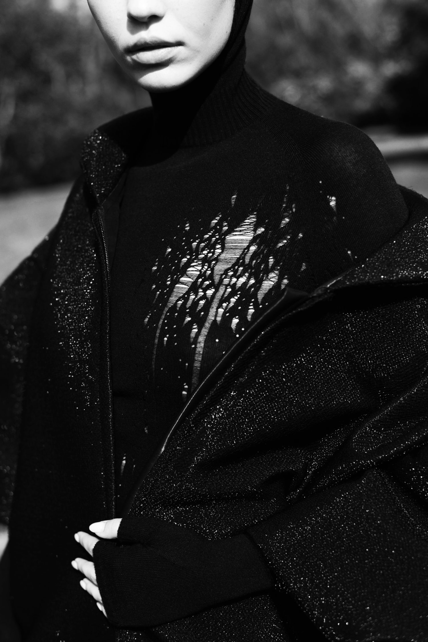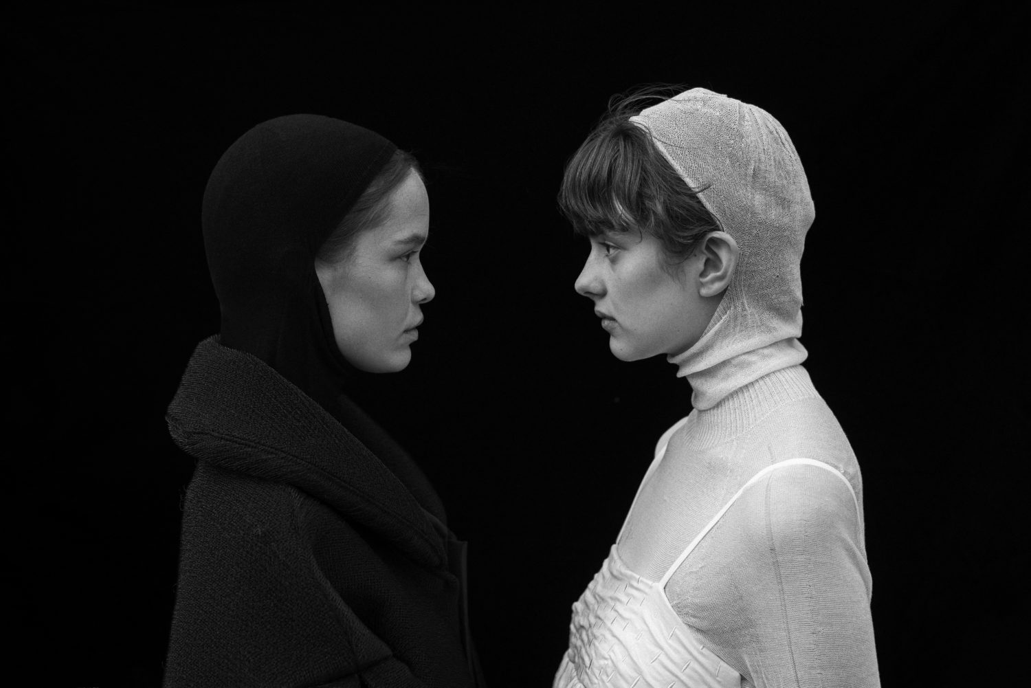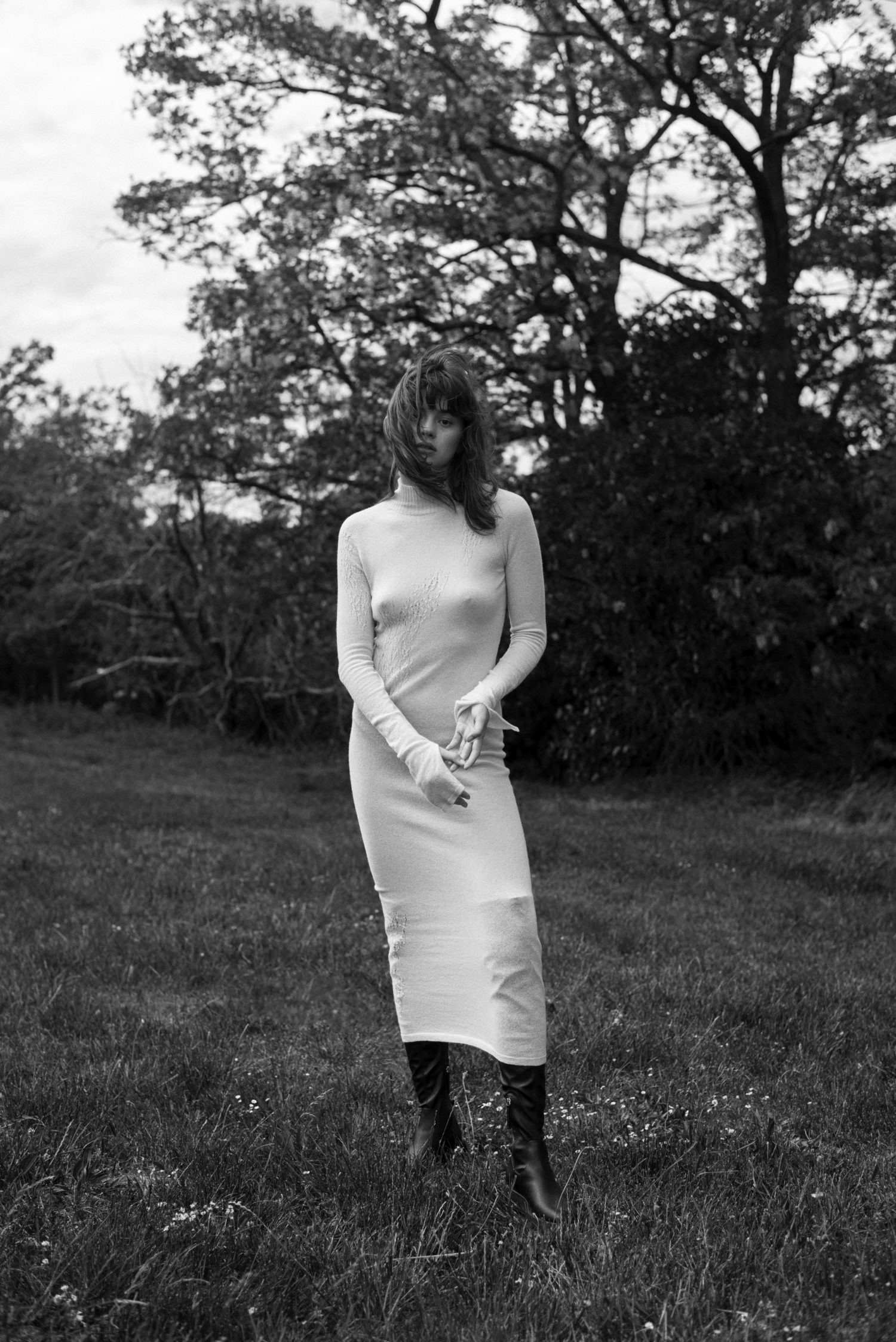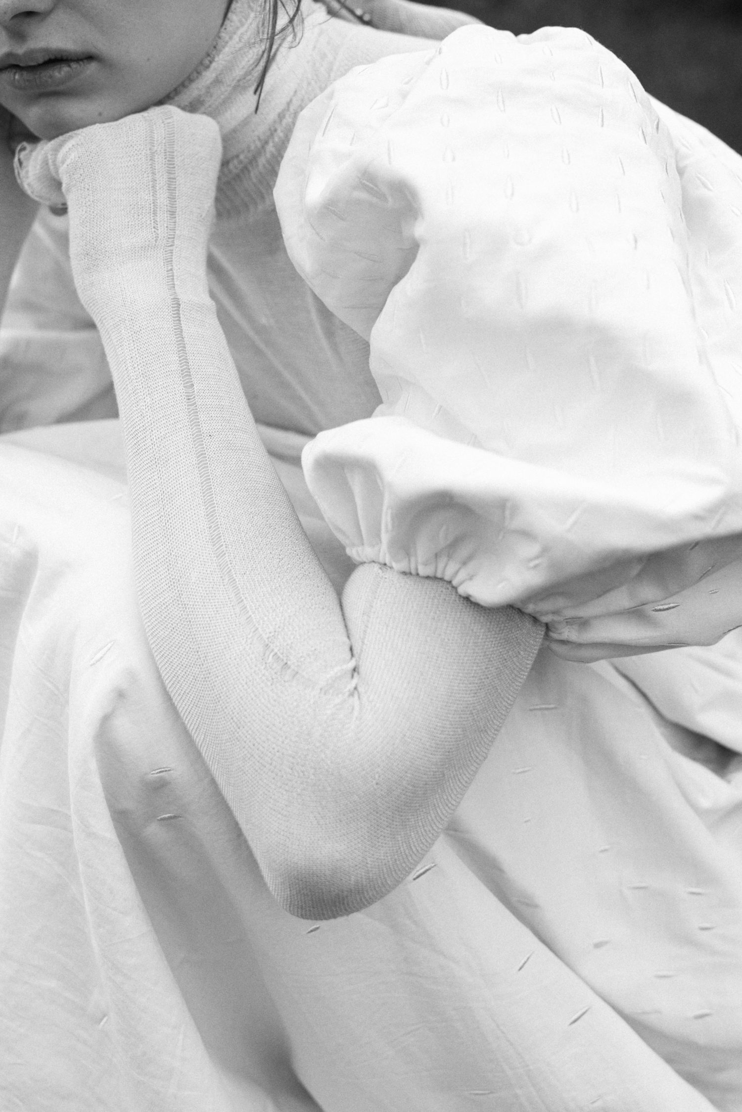 Kolekce je inspirovaná jejím dětstvím na Slovensku a ženami z její rodiny, které si navzájem pletly copy. I proto jsme jako detail zvolili náhodné shluky copánků. Bezešvé šaty jsme pletli buďto ze 100% hedvábí, nebo ze 100% kašmíru. Díky bezešvé technologii Shima Seiki nebyl problém oba materiály zpracovat. Pro šaty s více sportovním nádechem jsme pak použili směs staplové viskózy s elastanem.